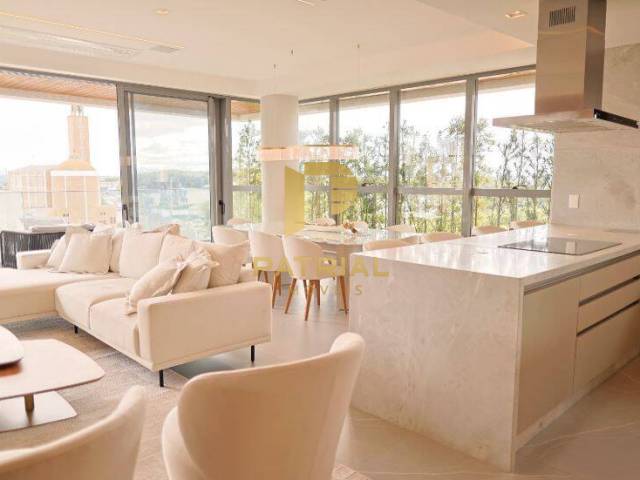 Esta Unidade está finamente mobiliada e equipada com ar condicionado marca LG de última geração em todos os ambientes, automação completa de som, luzes, ar condicionado e cortinas, com dispositivo Alexa controlados por aplicativo ou tablet; home theater, aquecimento no piso dos banheiros, toalheiro térmico na suíte master, desembaçador de espelho em todas as suítes, churrasqueira revestida em inox com kit elevatório elétrico, sala e cozinha revestidos em mármore branco Paraná, eletrodomésticos linha Electrolux Home Pro, piso na área íntima de madeira maciça estruturada, móveis soltos com peças assinadas (Masotti), móveis fixos linha Todeschini Premium, aquecedor de passagem de última geração, metais Deca, elevador TKE com biometria ou senha com desembarque direto no apartamento, todas as suítes face Norte.